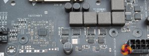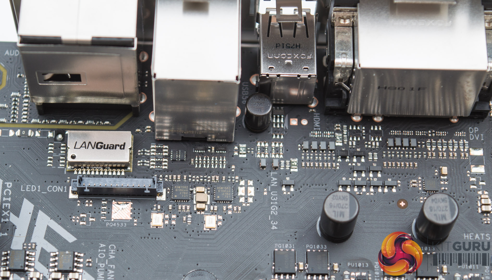 Near the rear I/O shield is the LANGuard module, the custom RGB LED connection and four ASM1562 ICs for the rear USB 3.1 ports.