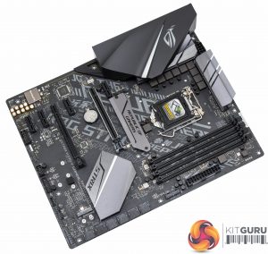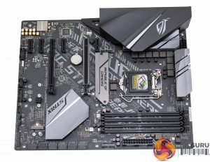 There are some similarities between the ASUS ROG Strix H370-F Gaming and its Z370 equivalent, but it is clear to see the design is substantially different in places. In general heatsinks are smaller and the plastic shroud is bigger and boxier. That said, in the context of H370 rivals, this ASUS motherboard is colour neutral and sensibly designed to blend into most builds.