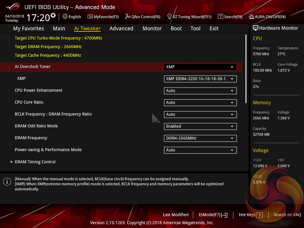AI Tweaker is the UEFI tab which contains the vast majority of performance tuning settings pertaining to the CPU and DRAM. From here you can set XMP profiles, set all the various voltages and voltage operation modes, change the Load Line Calibration (LLC) and more. However, it's worth noting the CPU cannot be overclocked because this is the H370 chipset, and any XMP profiles higher than 2,666MHz will automatically be reduced to 2,666MHz.