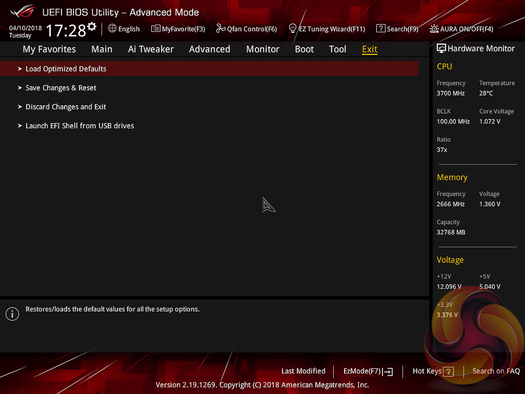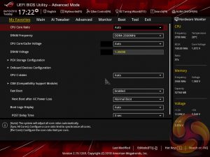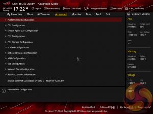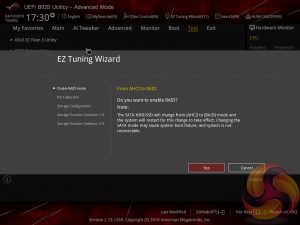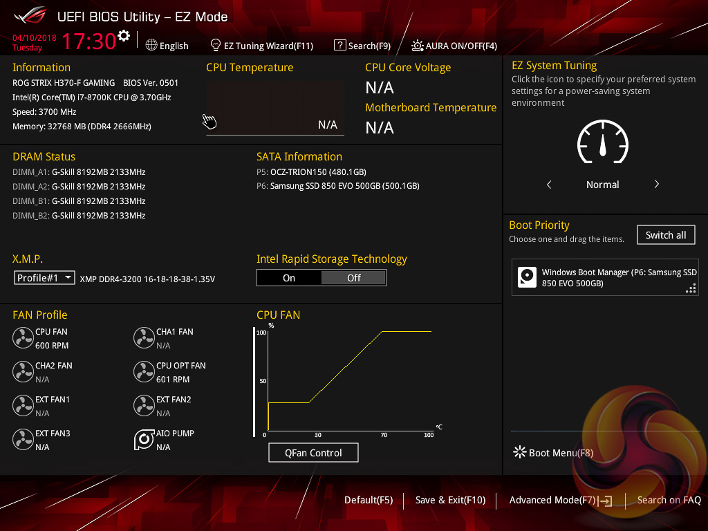 The ASUS UEFI opens onto the EZ Mode splash screen which has a selection of frequently used settings including XMP profiles, boot device order and fan speeds. Pressing F7 takes the user into the advanced section of the UEFI, but there are some additional tools that can be accessed from the splash screen such as Q-Fan Control and EZ System Tuning.