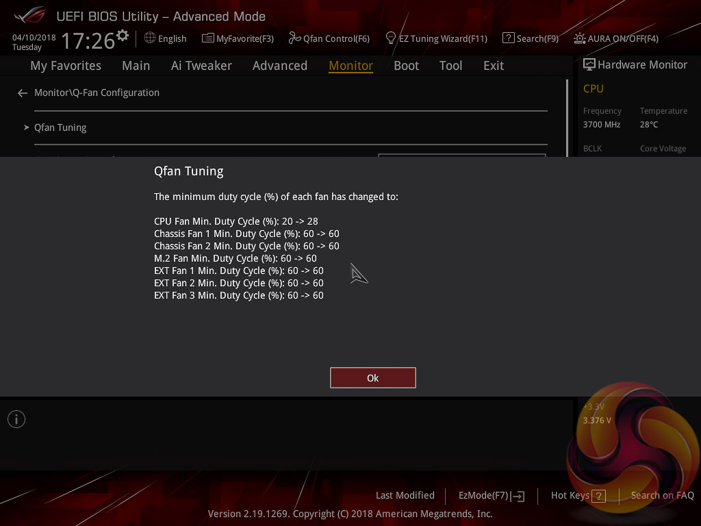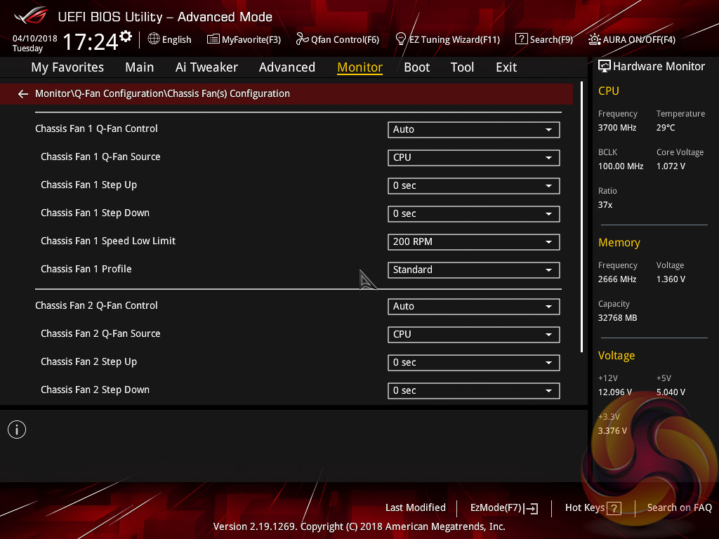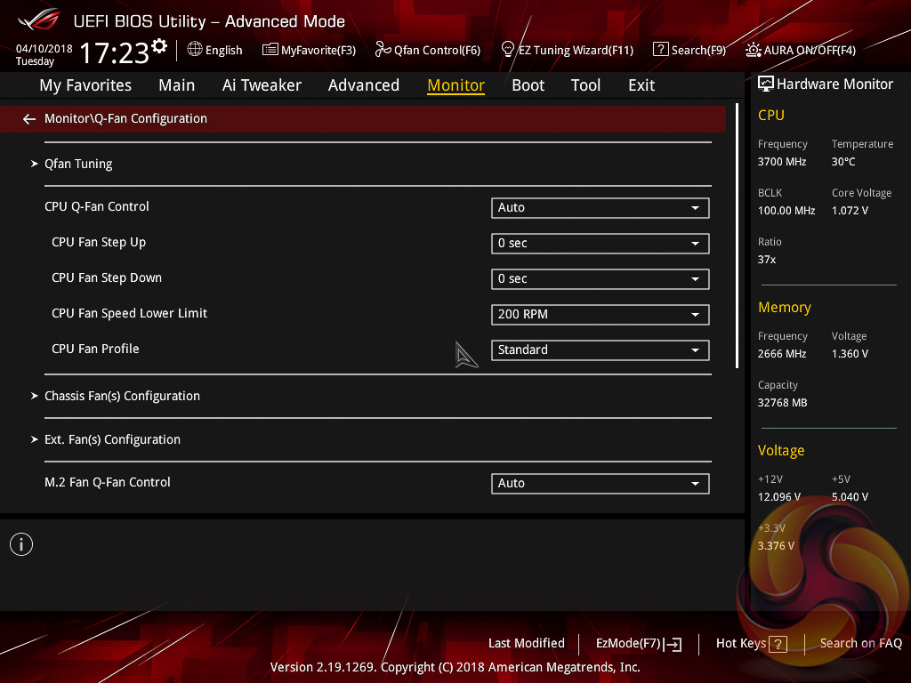 The Monitor tab will allow you to instruct the UEFI how to handle temperature data from the various sensors as well how to control fan speed profiles. For example, where a fan speed profile is temperature dependant you can choose which temperature sensor to use. If you purchase the optional ASUS Fan Extension card that can also be configured from within this section.