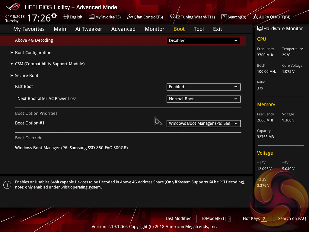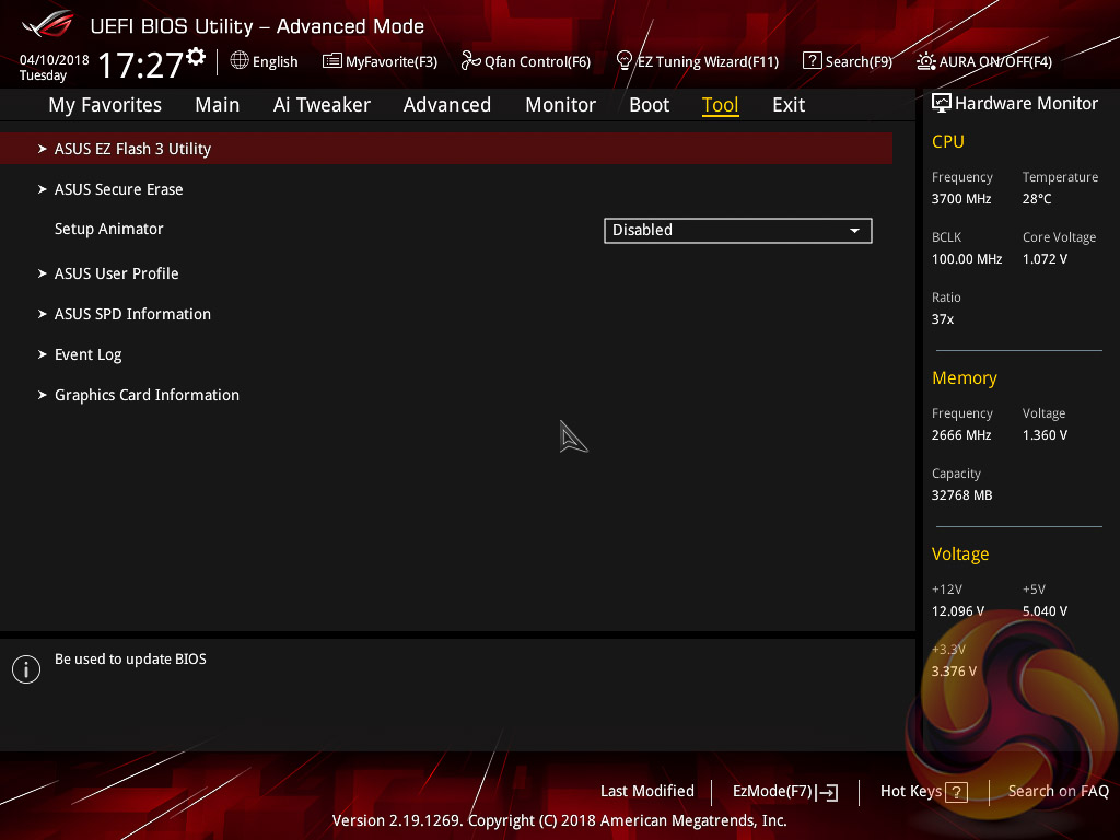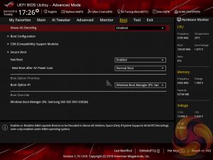 The Boot tab is as expected in delivering the key boot options such as secure boot, boot priority and boot compatibility options. Users needing to update the UEFI (via the EZ Flash Utility), save, import or export BIOS settings, or secure erase a storage drive should refer to the Tool tab.