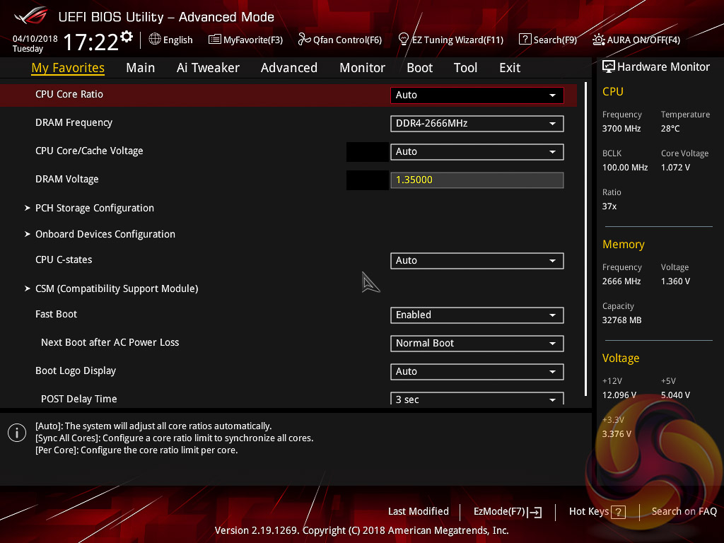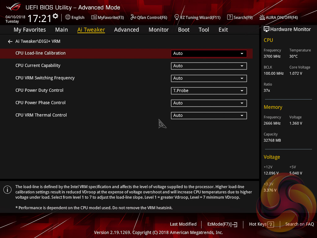 LLC has 9 options – Auto, Default and Levels 1 through 7. The CPU core voltage mode can be changed to override, adaptive or offset but for H370 it's only worth using the voltage options to achieve power consumption reductions since raising the voltage serves little purpose when the CPU is not overclockable.