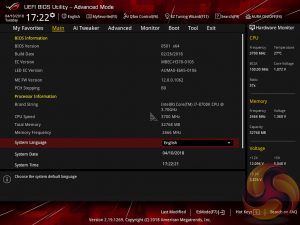 The first tab is MyFavorites which stores the most frequently accessed UEFI settings. The next tab, Main, contains detailed processor and BIOS version information.