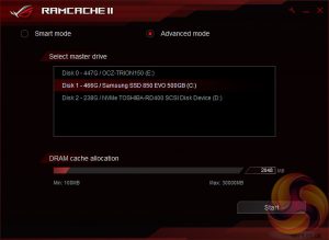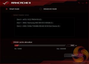 The ROG RAMCache II software aims to help with program loading and file transfers of regularly accessed data. Users simply need to set aside the amount of RAM they would like for caching and the RAM Cache II software handles everything else behind the scenes when in Smart mode. There is an advanced mode that gives some additional parameters for controlling the software’s behaviour.