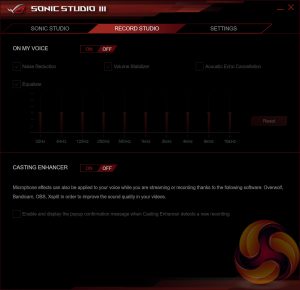 ASUS Sonic Studio III is an audio enhancement application which enables a range of different EQ presets and HRTF-based (Head related transfer function) virtual surround for virtual reality headsets.