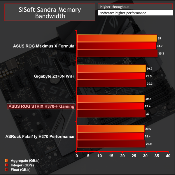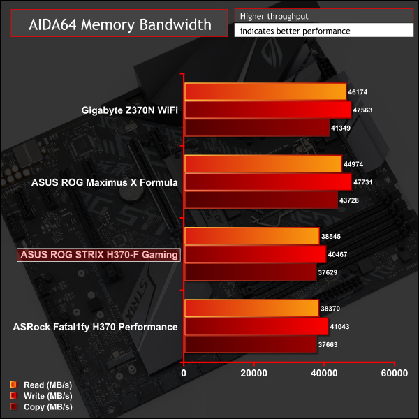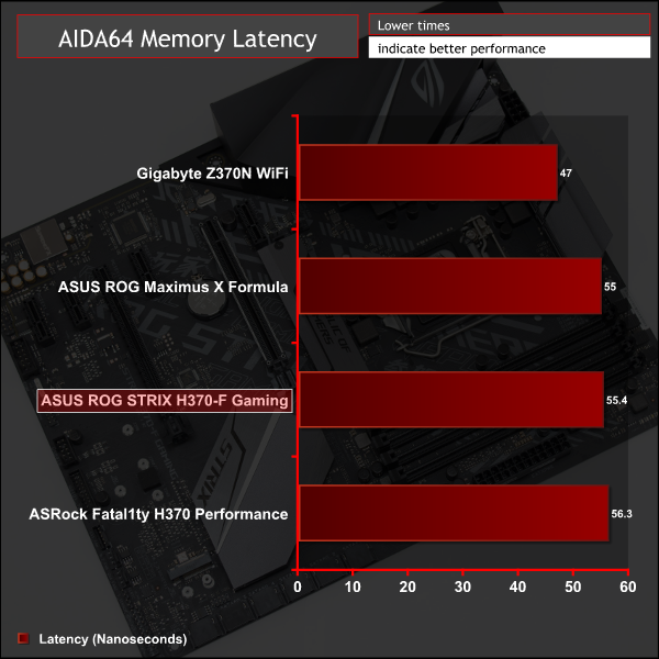 Memory performance takes a dive compared to the Z370 motherboards we previously tested since the 3,200MHz memory is now limited to 2,666MHz. However, if Z370 using 2,666MHz were to be compared to H370 using 2,666MHz, we expect that performance would be equivalent. However, overclocking the CPU can also enhance memory performance at the same frequency so Z370 definitely has the memory performance advantage.