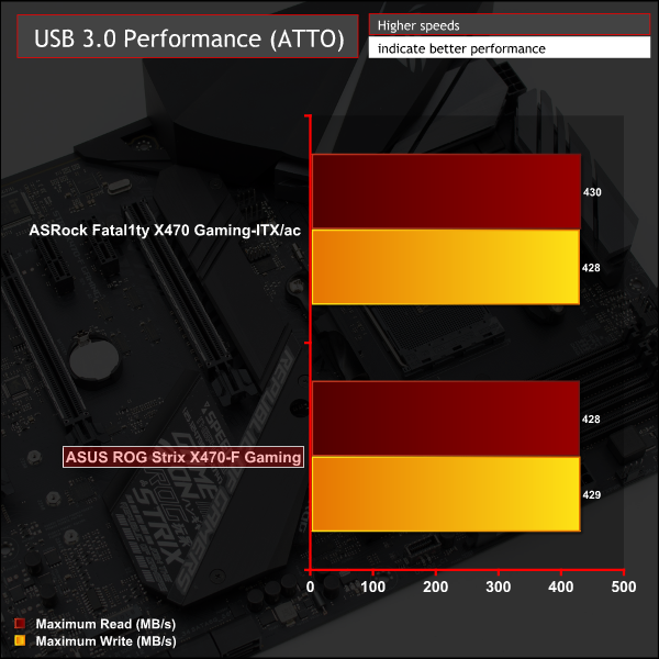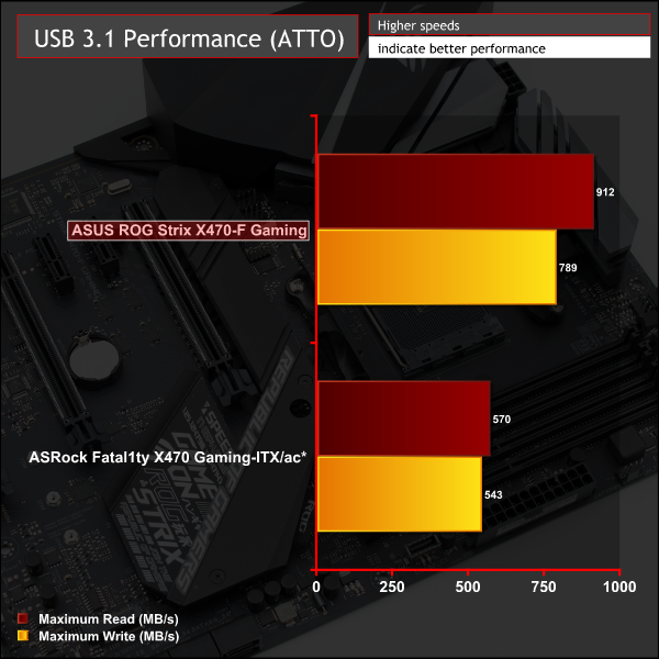 USB 3.0 and 3.1 performance was roughly in line with expectations noting that the USB 3.0 controller was the X470 chipset whilst the USB 3.1 controller was the ASM1142 controller, we were not able to test the X470 chipset USB 3.1 port.