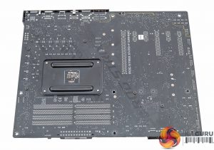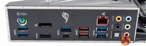 On the subject of RGB LEDs there is just a single zone which illuminates the rear I/O plastic shroud. The LEDs sit underneath the shroud on a separate PCB and the illumination comes through as a diagonal strip and the ROG logo. This RGB area is fully configurable in the ASUS AURA software and supports a wide range of colours and lighting modes, including synchronisation with the optional RGB headers.