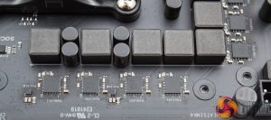 The next four phases which supply the SOC voltage are the same in terms of one choke and one IR3555 unit but also have two IR3599 phase doublers than turn two phases from the IR35201 controller into four phases for the motherboard's VRM.