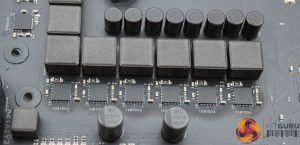 The structure of the VRMs is not clearly specified by ASUS but appears to be a 6+4 phase solution (effective), though the PWM controller likely operates 6+2 phases and is probably an IR35201 in 6+2 phase mode.