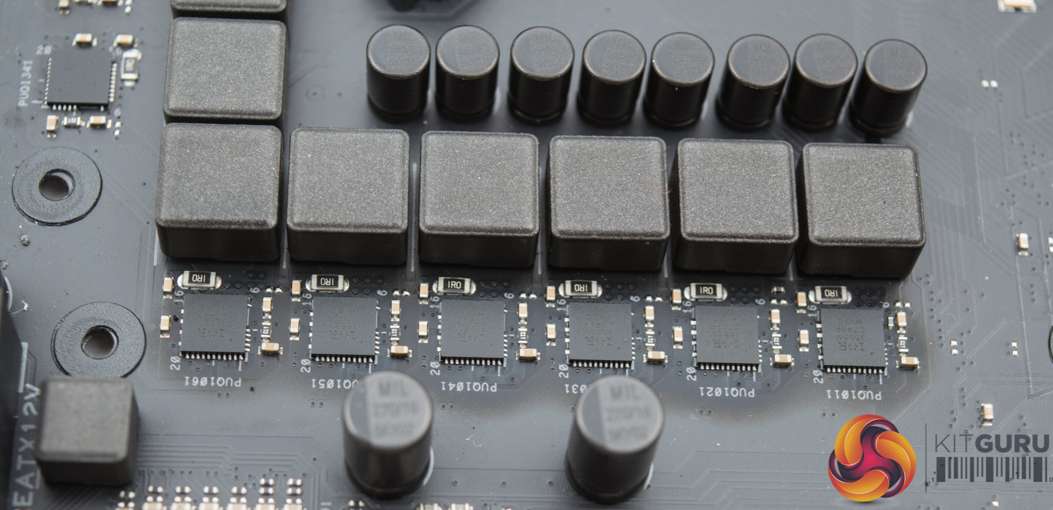 The first six phases that supply the CPU voltage each have one choke and one IR3555M 60-amp integrated PowIRstage. This IR3555 unit integrates the driver, low- and high-side MOSFETs into a single package.
