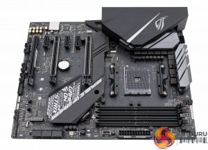 The design of the ASUS ROG Strix X470-F Gaming is mostly subtle with a sleek black design though the “artistic” application of text on the heatsink and printed on the PCB may polarise consumers. The plastic shroud over the rear I/O area continues to be a recurring trend on ASUS ROG motherboards since it tidies up the overall aesthetic and allows for a more creative implementation of RGB LEDs filtered through the ROG logo.
