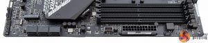 Two RGB headers, 12V G R B and 5V digital, are located at the end of the motherboard along with a trio of two USB 2.0 and one USB 3.0 headers. The slower PCIe 3.0 X2 M.2 slot is also located in this section of the motherboard and supports only shorter 80mm drives.