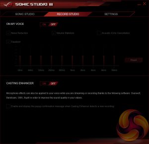 ASUS Sonic Studio III is an audio enhancement application which enables a range of different equaliser presets and HRTF-based (Head related transfer function) virtual surround for virtual reality headsets.