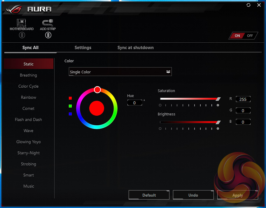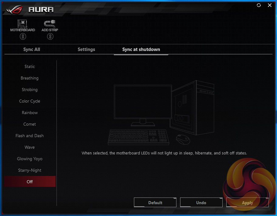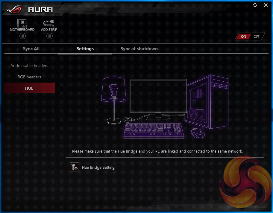 The settings tab details a few more compatibility options such as for calibrating RGB LED strips, integrating a Hue Bridge (Phillips Hue product integration) and the Sync at shutdown tab allows users to specify the “turned off” (standby power after shutdown) behaviour of the motherboard's RGB LEDs.