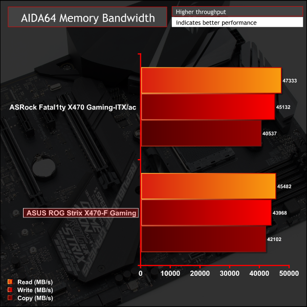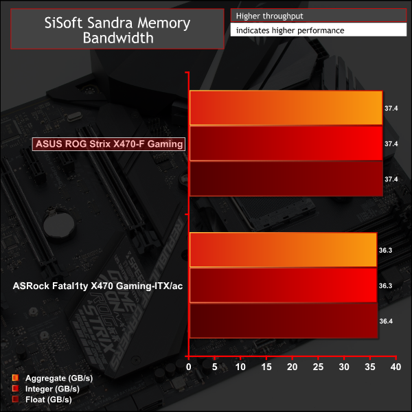 Memory performance was very similar between the two X470 motherboards on test, with the variation that we did observe possibly down to the fact the ASRock ITX motherboard was only using two memory modules (ITX form factor limitation) compared to the four memory modules on the ASUS ATX motherboard.
