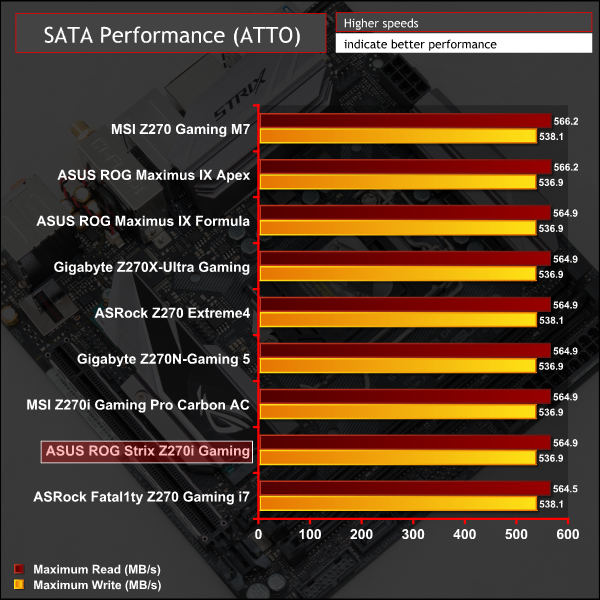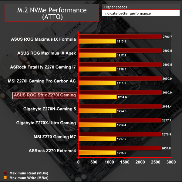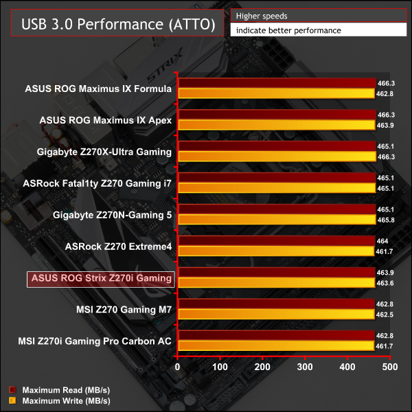 Since the ASUS ROG Strix Z270i Gaming uses a USB 3.1 front panel header and has no other USB 3.1 ports, we weren't able to test its performance as we did not have a compatible chassis or front panel adapter available. Nonetheless, with it using the same ASMedia ASM2142 USB 3.1 controller as all the competition, performance should be comparable, if not identical.