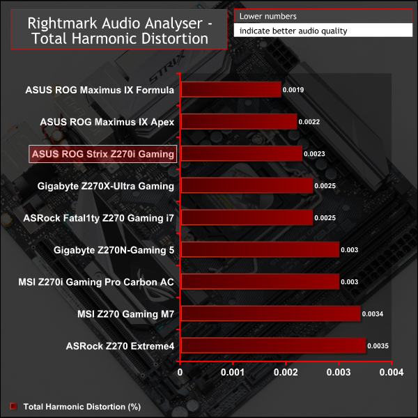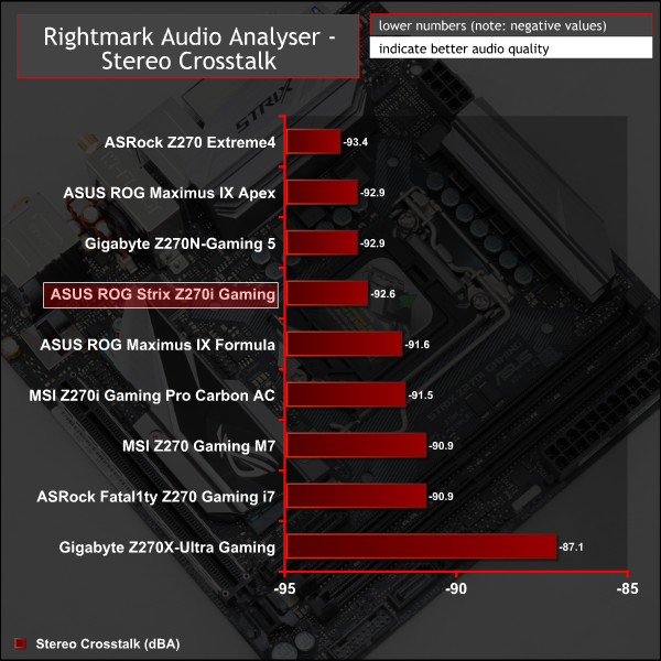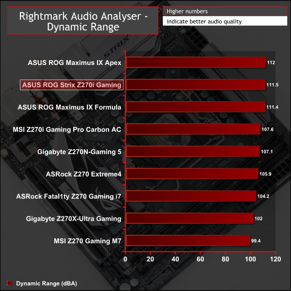 ASUS has the best performing audio solutions of any motherboard vendor for the Z270 generation. Unsurprisingly, this means the Z270i Gaming was among the top three motherboards of which the other two are also ASUS motherboards. That said, most Z270 motherboards of the mid-range to high-end use Realtek's very capable ALC1220 codec so few users will be left disappointed by the audio quality available to them.