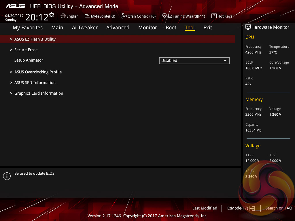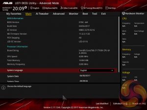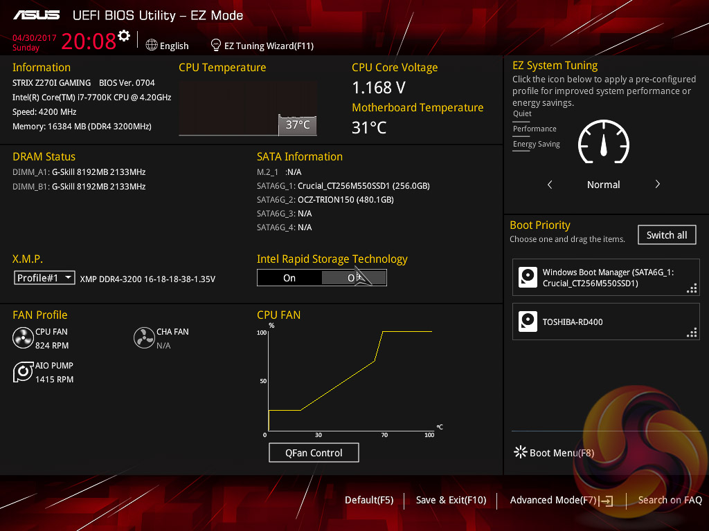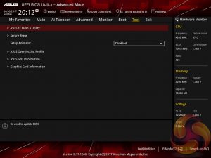 The ASUS UEFI enters straight into the EZ Mode splashscreen which has a selection of frequently used settings including XMP profiles, boot device order and fan speeds. Pressing F7 takes the user into the advanced section of the UEFI but there are some additional tools that can be accessed from the splash screen.