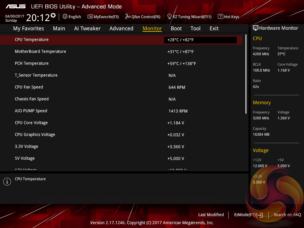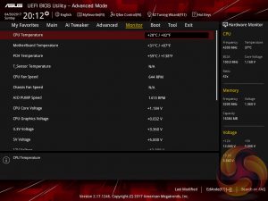 The Monitor tab will allow you to instruct the UEFI how to handle temperature data from the various sensors as well as what to do with fan speed profiles. For example where a fan speed profile is temperature dependant you can choose which temperature sensor to use.
