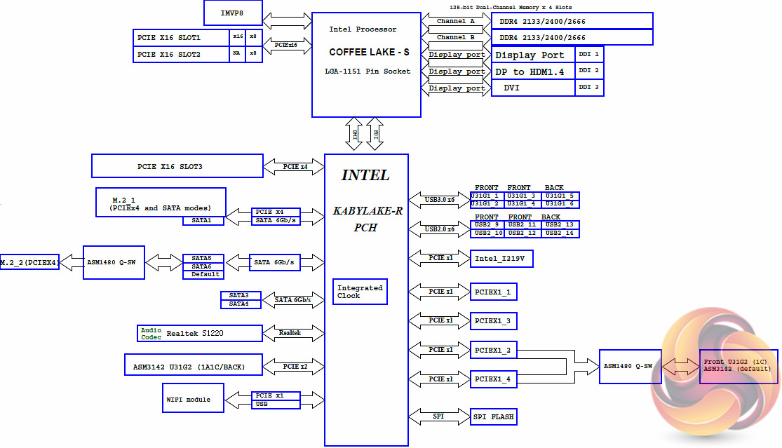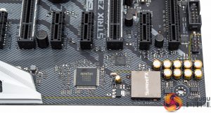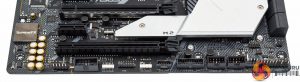 The block diagram varies only slightly between other motherboards in its class. Where it does vary is two of the PCIe 3.0 X1 slots being shared with a front panel USB 3.1 header in an “either/or” scenario. Similarly, there is an M.2/SATA bandwidth sharing system in place which means if you use two PCIe M.2 drives you lose two SATA ports, if you use only 1 PCIe drive then you maintain access to all six SATA ports.