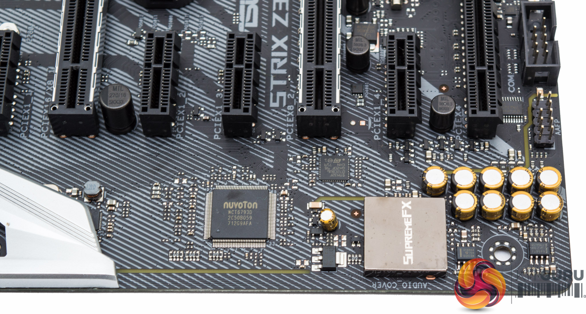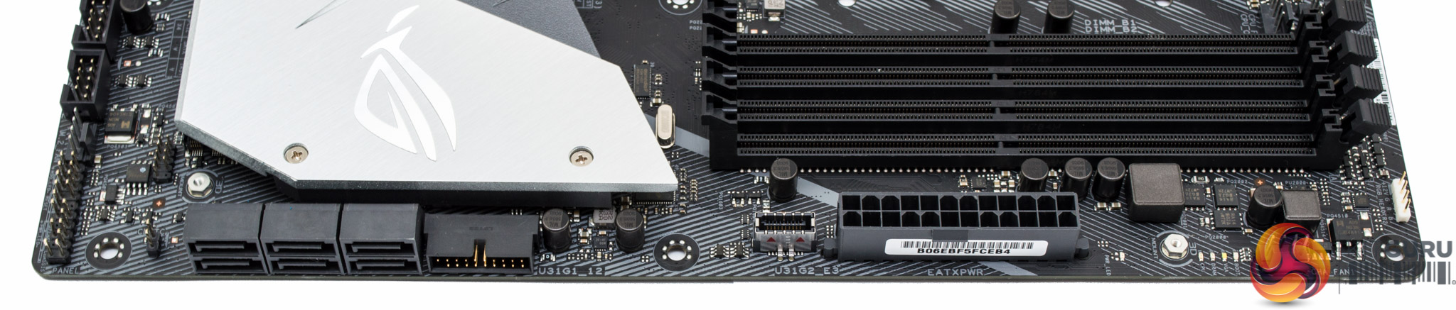 ASUS clusters all six SATA ports in the same location which is helpful for cable management. Along that right-hand edge of the motherboard is USB 3.0 and USB 3.1 front panel headers. Unlike MSI's Z370 Gaming Pro Carbon AC there's no recessed gap between the connectors and the edge of the motherboard.