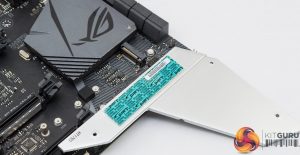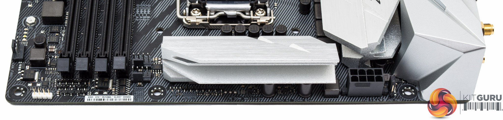 The CPU VRM is cooled by a pair of aluminium heatsinks each with thermal pads. The M.2 drive is cooled by an additional heatsink which screws onto the chipset heatsink and motherboard, also with a thermal pad.