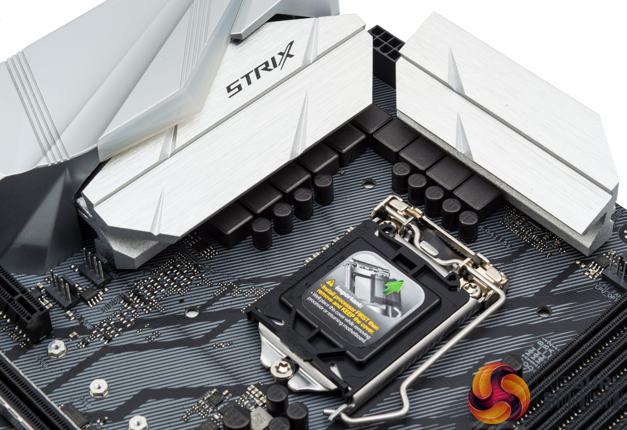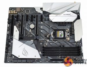 The aesthetic design for the ROG Strix Z370-E Gaming is black with silver-metallic accenting on the heatsinks and rear I/O shield, compare that to the Z270-E which was black and dark-grey. ASUS implements are rather unique shading and hatching effect onto the PCB which is unusual and certainly adds a certain something to the design and presentation.