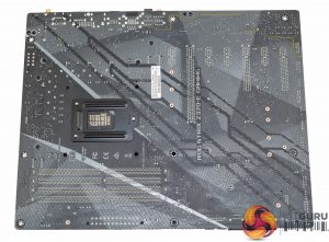 Underneath the motherboard gives a better glimpse at the patterned PCB design. Additionally, all the heatsinks and shrouds are secured with standard cross head screws making for easy maintenance and modification.