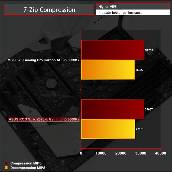 7-Zip is an open source Windows utility for manipulating archives. We measure the Total Rating performance using the built-in benchmark tool. The test stresses all CPU cores to 100% and shows an affinity for memory bandwidth.