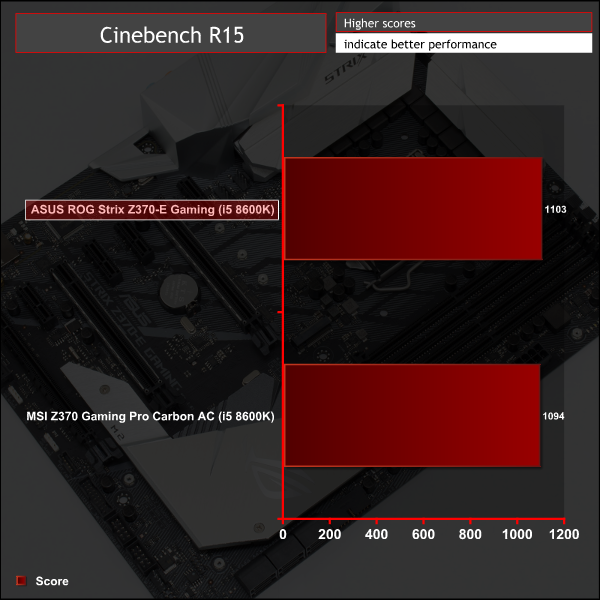 CPU performance is surprisingly potent with Intel's new 6-core i5 8600K. There may be no Hyper-Threading on offer with the i5 but the numbers still look good thanks to the extra two cores and high turbo frequency of 4.3GHz. There is minimal variation between motherboards on test too, which is what we'd expect to observe.