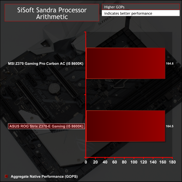 SiSoft Sandra 2017 is a multi-function utility program that supports remote analysis, benchmarking and diagnostic features for PCs, servers, mobile devices and networks. We run the application’s processor arithmetic test to gauge the CPU performance on each tested motherboard.