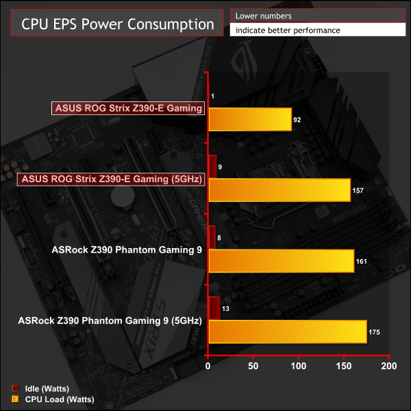 To test the ASUS ROG Strix Z390-E Gaming motherboard’s CPU overclocking potential, we set the CPU core voltage no higher than 1.3V and push for the highest stable clock speed. We maintain the DRAM frequency at 3200MHz to take memory stability out of the overclocking equation.