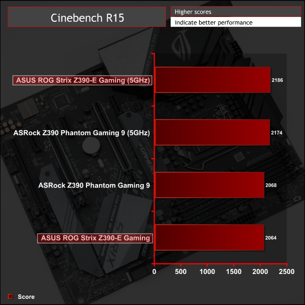 Due to ASUS allowing the Intel i9 9900K to run at Intel specification, with user input, the stock numbers are considerably lower than the ASRock motherboard. However, when overclocking the gap almost disappears.
