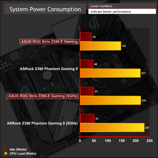 We leave the system to idle on the Windows 10 desktop for 10 minutes before taking a reading. For CPU load results we run AIDA64 CPU, FPU, Cache and Memory stress tests and take a reading after 10 minutes. The power consumption of our entire test system (at the wall) is shown in the chart.