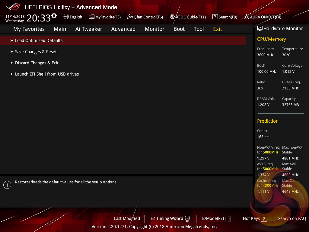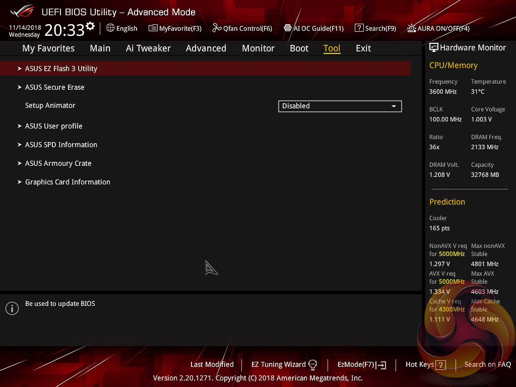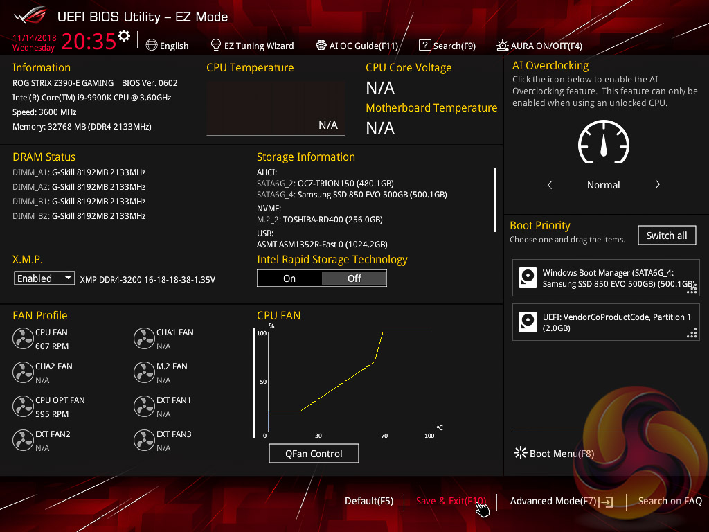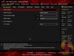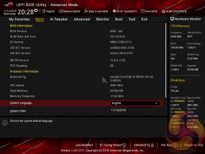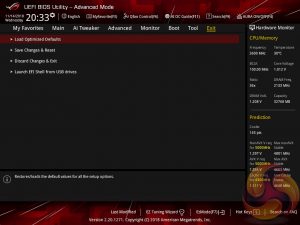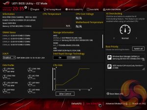 The ASUS UEFI enters straight into the EZ Mode splash screen which has a selection of frequently used settings including XMP profiles, boot device order and fan speeds. Pressing F7 takes the user into the advanced section of the UEFI but there are some additional tools that can be accessed from the splash screen such as Q-Fan Control, EZ System Tuning and AI Overclocking.
