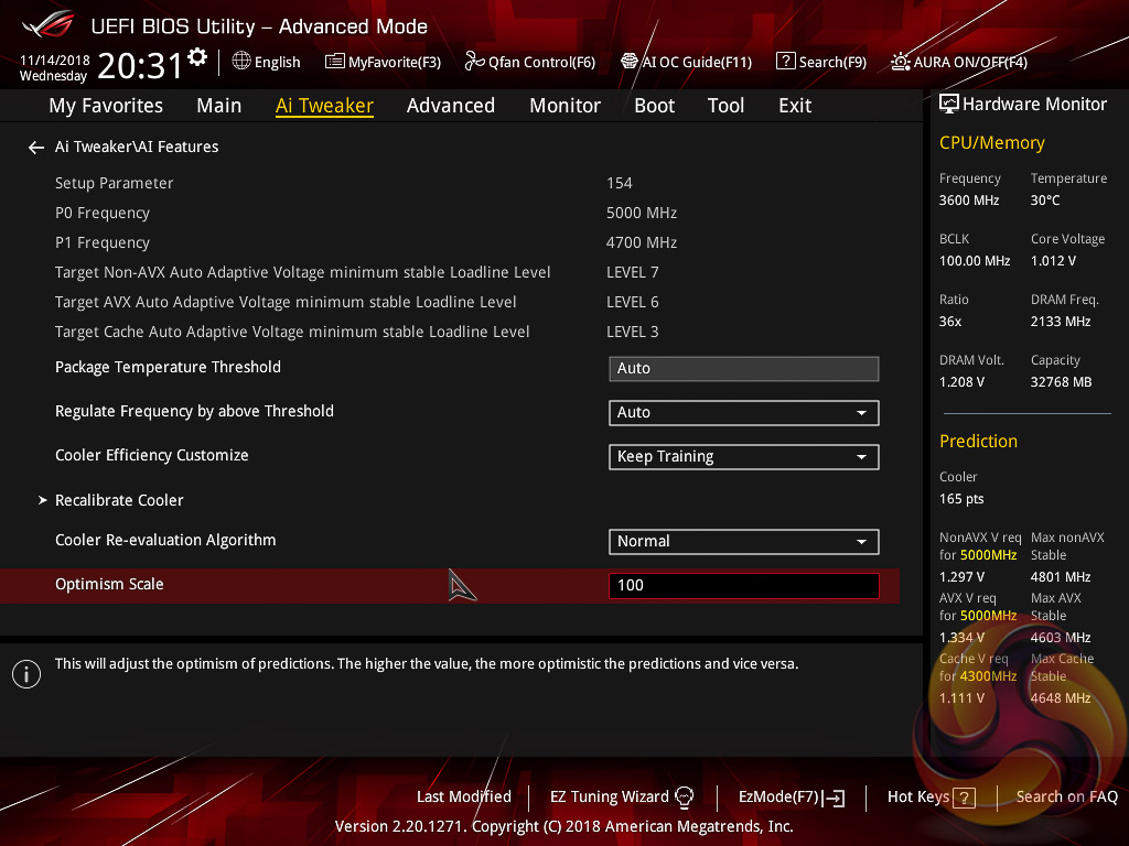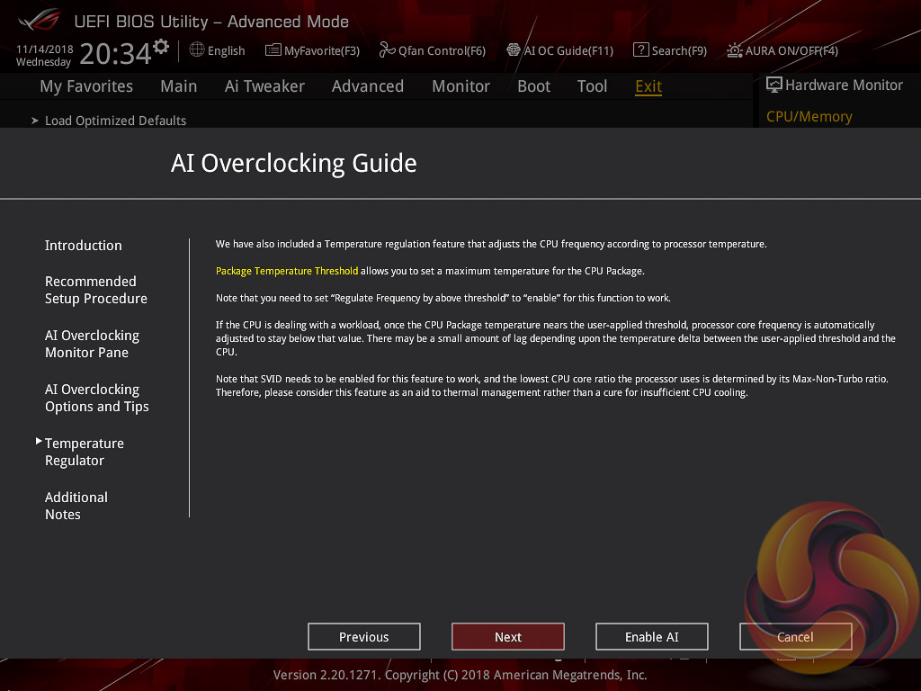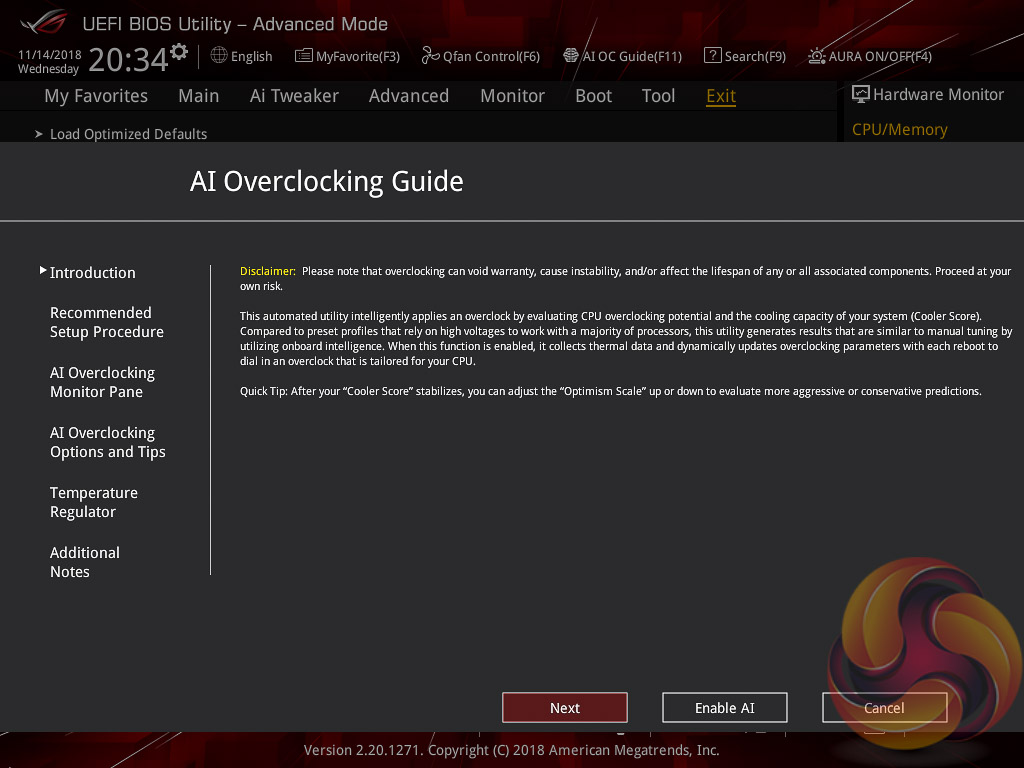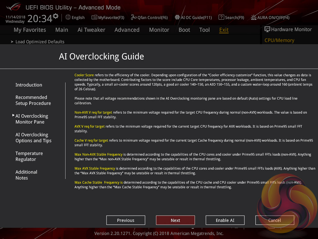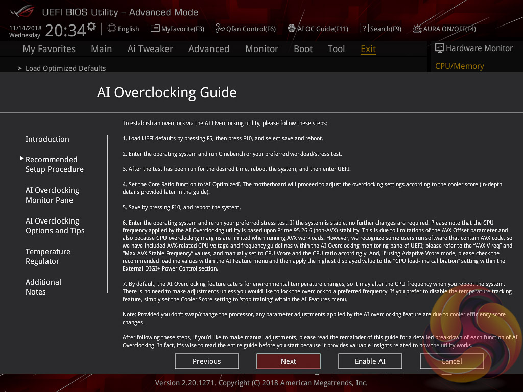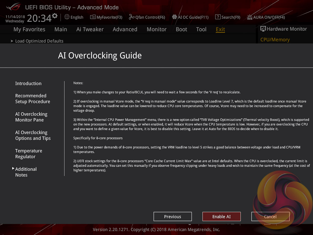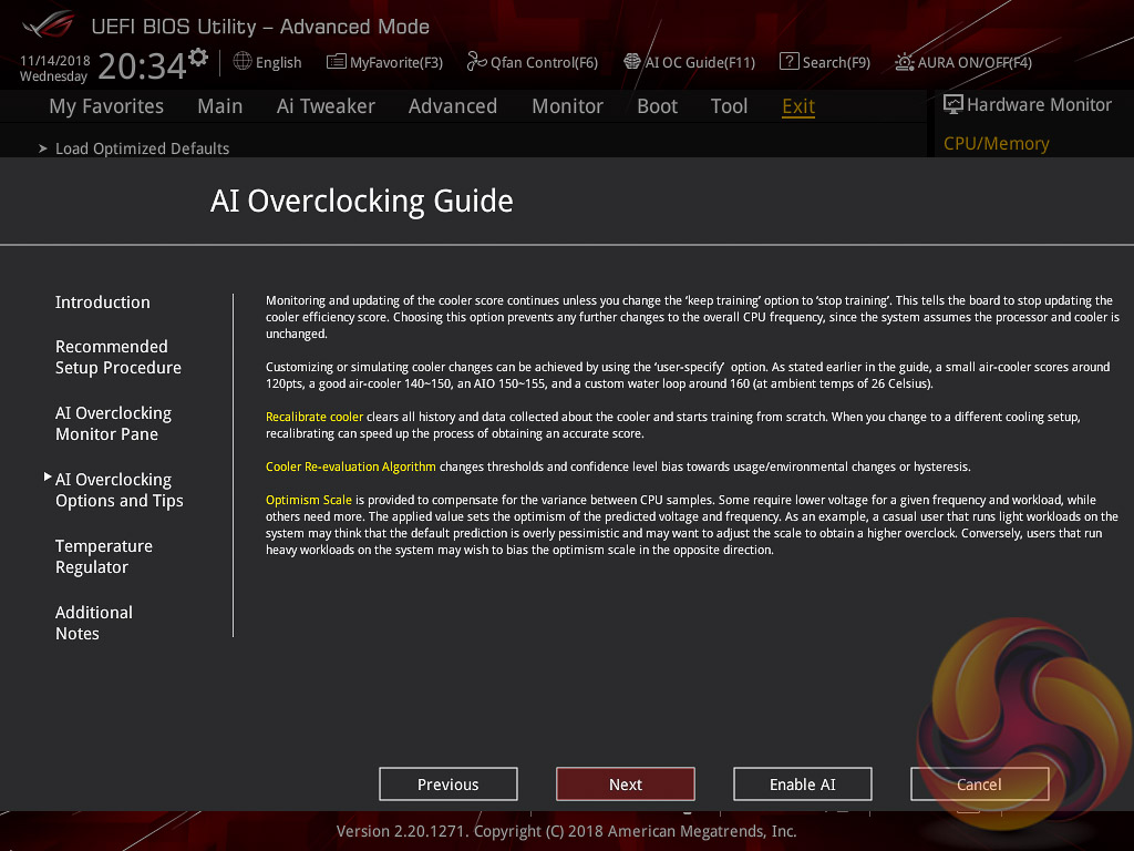ASUS has implemented a new “AI” overclocking feature which can be enabled through the “AI OC Guide” window (F11). This has an “optimism scale” associated with it which will determine how adventurous the target overclock will be, there's also a cooler calibration test which effectively tests “how good” your CPU cooler is before attempting higher voltages. The scale ranges from 50, least optimistic, to 150, most optimistic, with 100 being the default.
