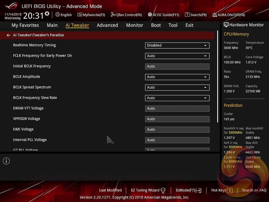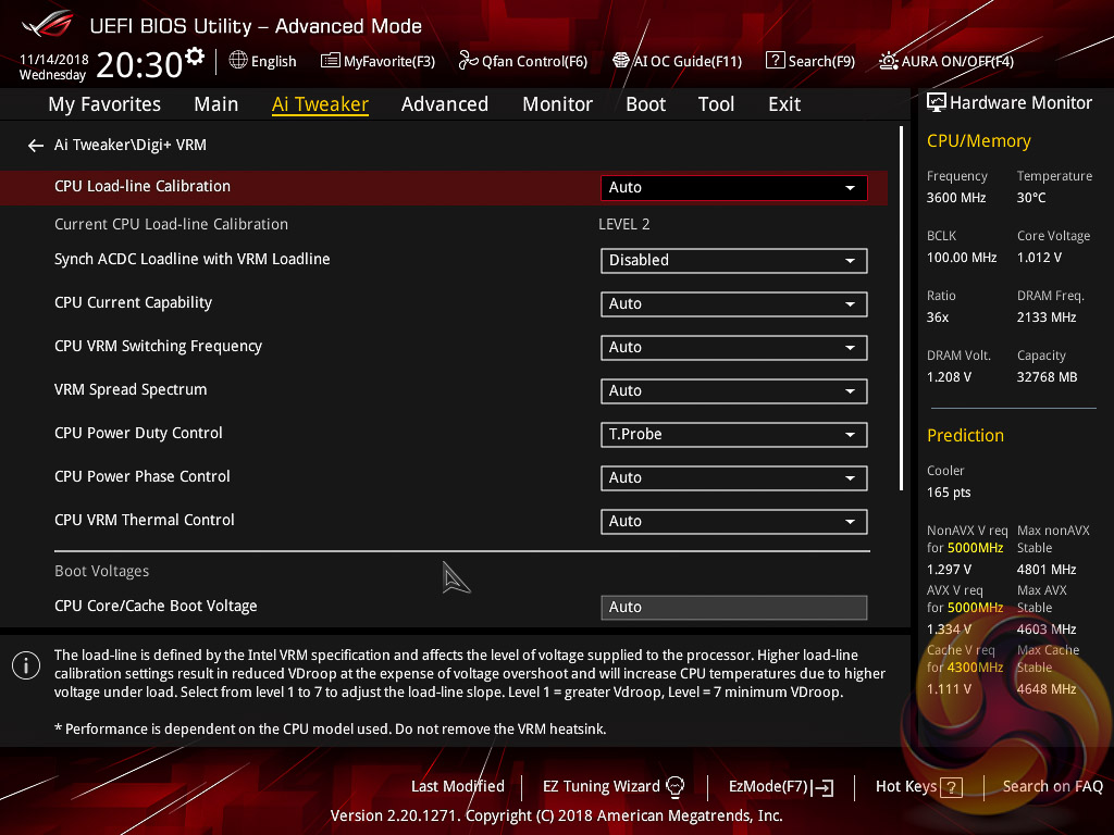AI Tweaker is the UEFI tab which contains the vast majority of performance tuning settings pertaining to the CPU and DRAM. From here you can set XMP profiles, overclock the CPU, set all the various voltages and voltage operation modes, change the Load Line Calibration (LLC) and considerably more.