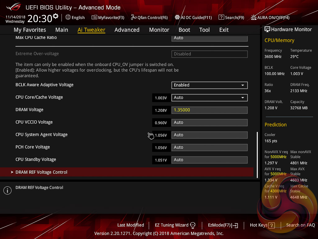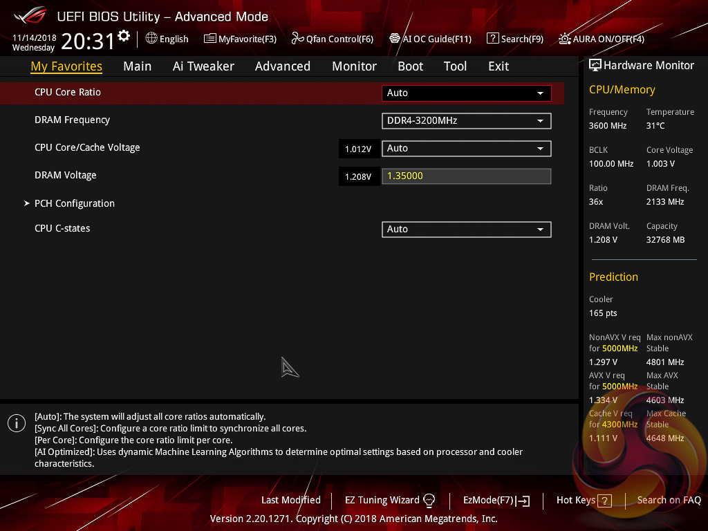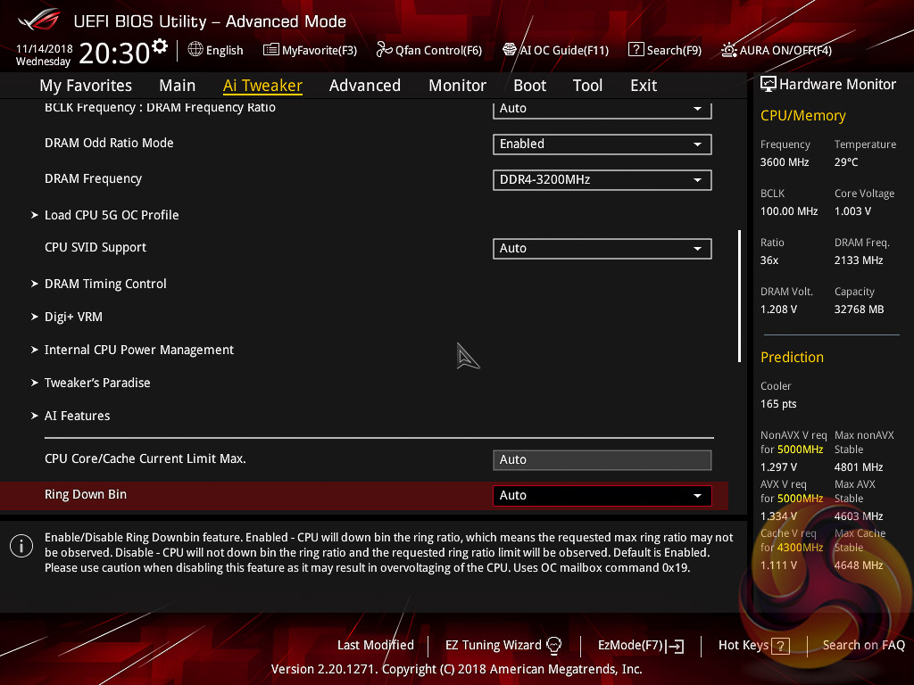 ASUS claims they have developed a “proprietary algorithm” which tests the quality of the CPU and mixes that with the capability of the CPU cooler to give a better result. When we enabled this using “100” optimism after calibrating our CPU cooler we got a 166 points score for the CPU cooler, with a “4.8GHz” turbo mode for non-AVX workloads and 4.6GHz with AVX and 4.65GHz cache. The light load result was 5GHz while the heavy load result was 4.8GHz, all using 1.204~1.257v (non-AVX/AVX) for the CPU and 1.1v for the Cache.