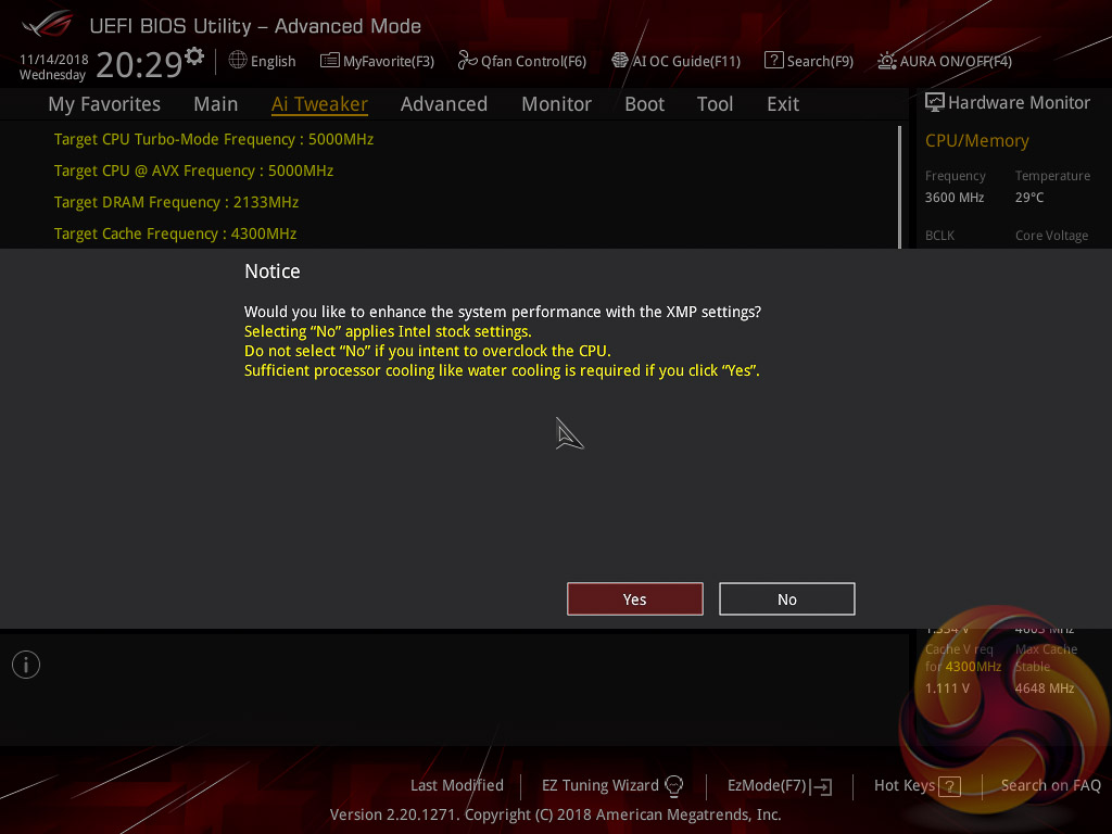 The UEFI provides a clear warning that when enabling XMP there is a choice to opt out of enhanced Turbo functionality and stick to Intel’s default CPU specification, particularly pertinent for Intel's new i9 9900K which can consume large amounts of power. The same also applies for the memory specification which ASUS claim can be enhanced (XMP I) instead of sticking to the complete XMP profile (XMP II).