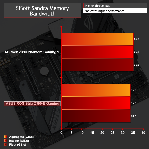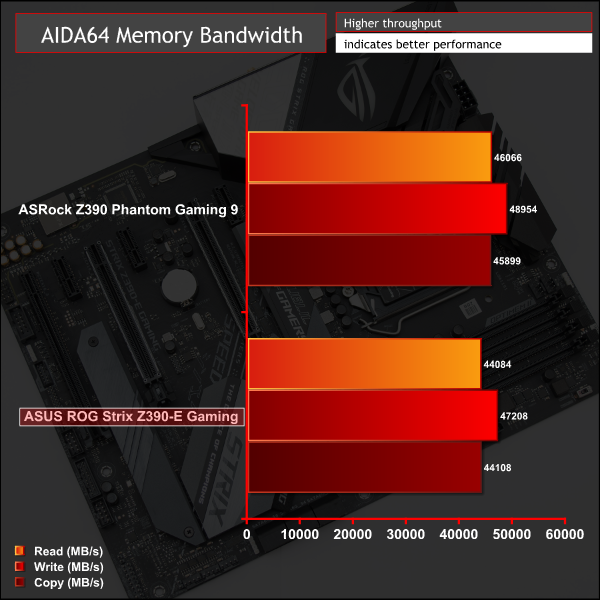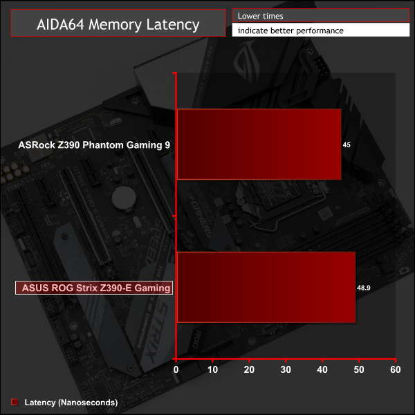 The previously mentioned CPU Turbo settings that cause the ASRock motherboard to operate the CPU faster, with higher power consumption, carry over to the memory tests too. Additionally, ASUS offered a choice of optimising memory parameters when selecting an XMP profile, which ASRock did not.