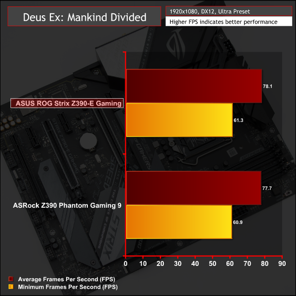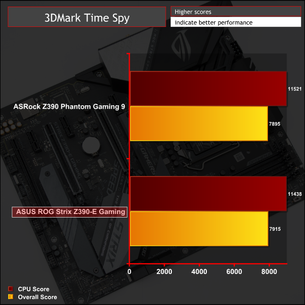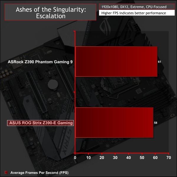 GPU performance varies only slightly with the main cause of the performance difference the previously mentioned CPU and memory tuning that ASRock does as part of the “auto” settings. ASUS gives the users the chance to opt out of that when setting the XMP profile. It's important to note that the difference in performance between motherboards, as a general rule, doesn't mean one motherboard is “faster” or “better” than the other, just operating using a different set of parameters or power constraints.
