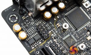 The audio section features PCB isolation with the codec hiding in between the rear I/O items. There are gold audio series capacitors as well as two operational amplifiers, both by Texas Instruments – OPA1688 and R4580I.