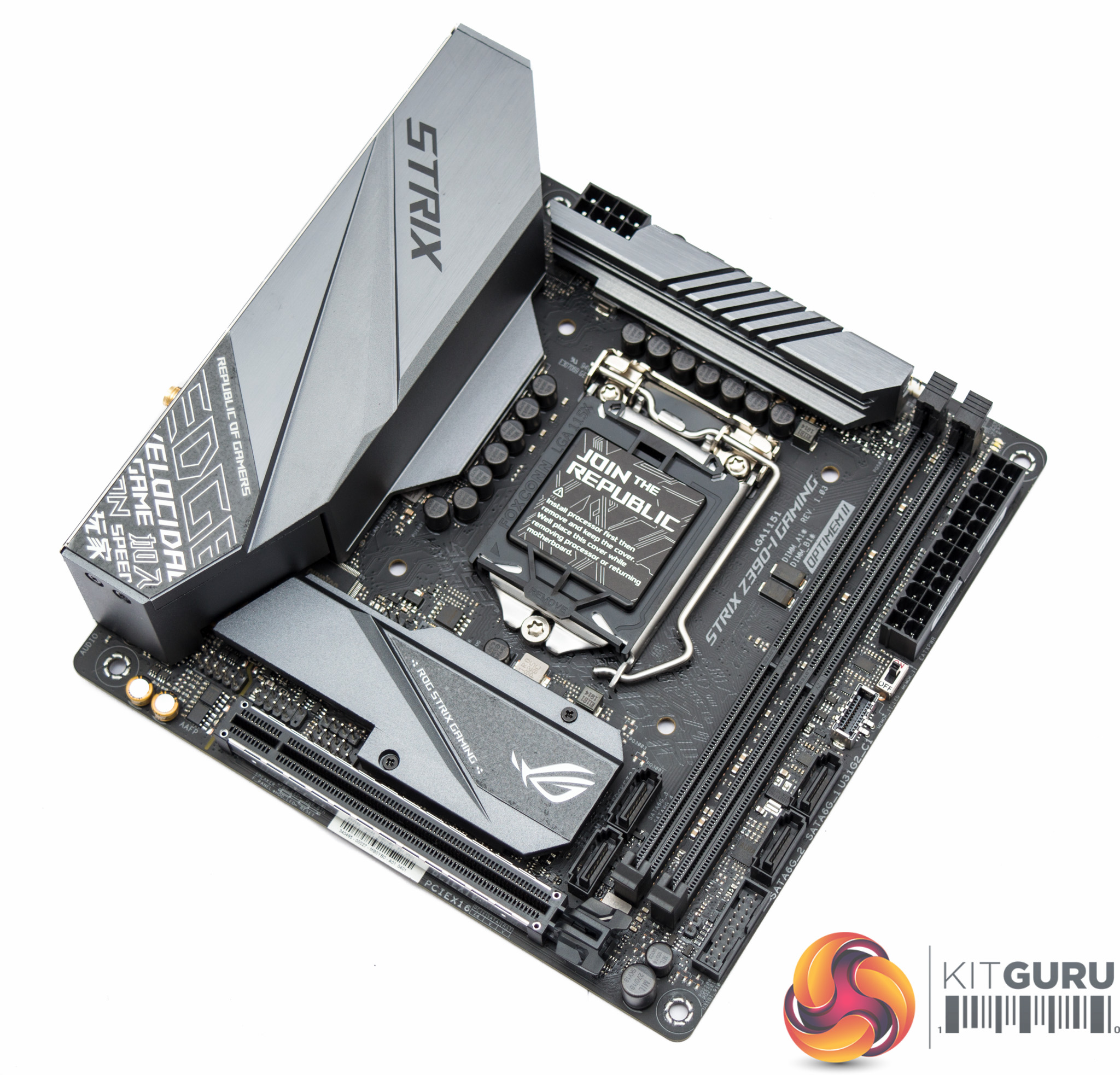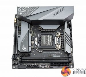 The aesthetics of the ASUS ROG Strix Z390-I Gaming have distinctively evolved from the Z370-I and Z270i predecessors. The overall look is smart, with a neutral colour palette, and makes good use of heatsinks and an I/O cover to deliver visual appeal that is typically difficult to achieve on such a small motherboard.