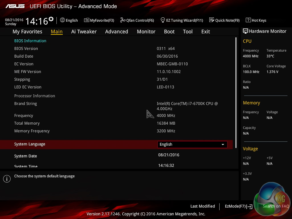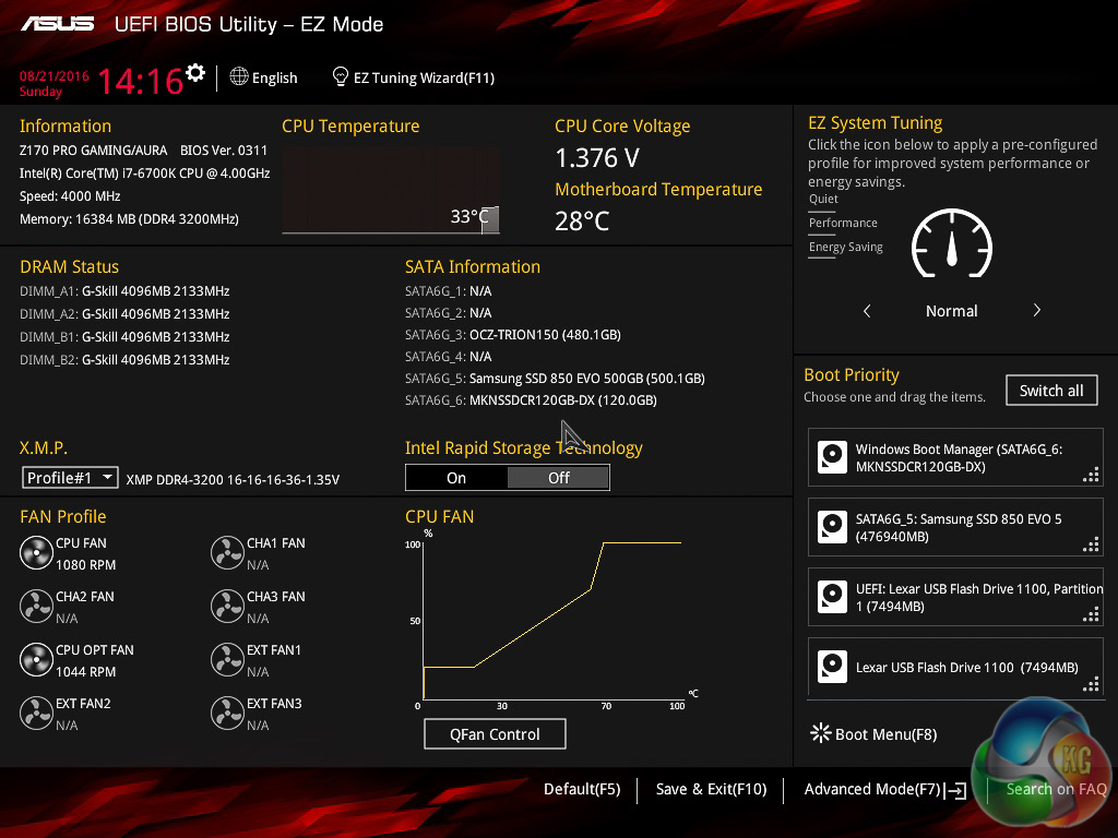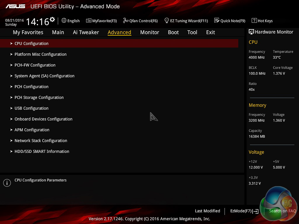 Upon first entry to the UEFI, ASUS displays the EZ Mode “splashscreen” that has all the key options like XMP, boot priority and fan tuning. Pressing F7 takes the user into the “Advanced Mode” where the full range of UEFI/BIOS options are made available