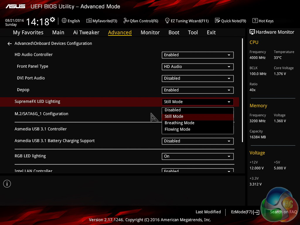 The “SupremeFX LED Lighting” refers to the red LED strip along the separated audio PCB. You can disable this completely or set it to one of three operation modes. There's also the option to turn the RGB lighting on or off, though customisation such as colour and lighting patterns have to be edited from within the AURA RGB software.