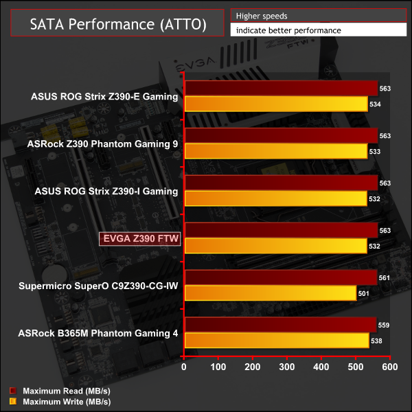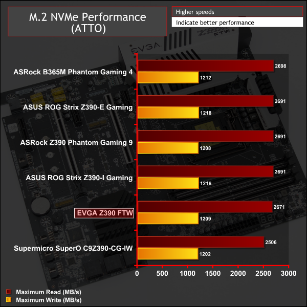M.2 performance was standard fare but the cooling is very limited. EVGA provides “thermal pads” but since these have not heatsink to transfer heat into, they make minimal difference to temperatures and the M.2 drives will eventually throttle unless third party cooling, or significant airflow, is added.