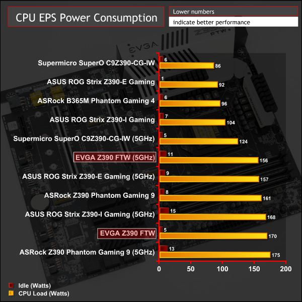 Similarly, power consumption measured at the 8pin EPS connector showed a similar drop when overclocking.