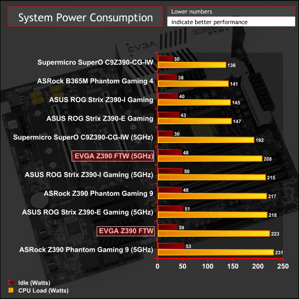 We leave the system to idle on the Windows 10 desktop for 10 minutes before taking a reading. For CPU load results we run AIDA64 CPU, FPU, Cache and Memory stress tests and take a reading after 10 minutes. The power consumption of our entire test system (at the wall) is shown in the chart.